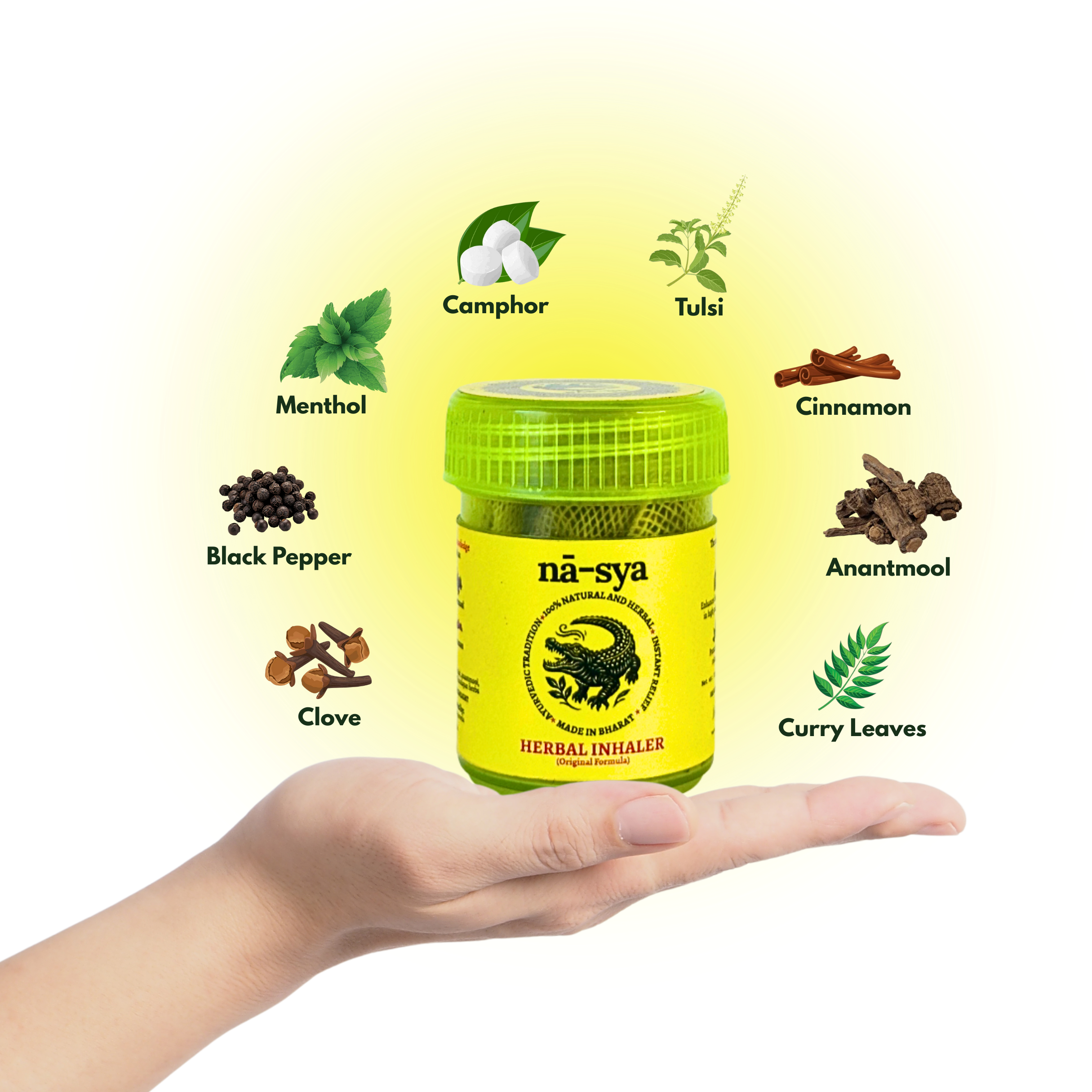 Breathe easy, anytime, anywhere with the nā-sya Herbal Inhaler - a powerful blend of pure essential oils and ancient Indian herbs like menthol, camphor, burneol, tulsi, clove, anantmool and more.